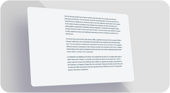 Over the last year, people have refused to settle for jobs that make them unhappy, and millions of Americans quit their jobs. This era has been coined the “Great Resignation,” but at the same time, the “Great Rehiring” is happening as companies seek to meet their aggressive growth goals and hire people on the market. However, the pandemic has changed what employees care about, and they’re now seeking higher compensation and flexible working arrangements. Companies have adapted to these changing workforce trends to attract and retain top talent. Thus, we’re seeing unprecedented increases in sales, customer success, and marketing compensation, and more companies are going all-in on remote work. For the first time, entry into tech sales starts at $50k, a significant increase from the average of $40k in the past. Furthermore, tech is becoming more decentralized, and companies have embraced remote work. This has resulted in a flattening of compensation across the country, so there’s a more negligible difference between compensation in San Francisco and New York compared to other cities. In addition, remote hiring is still a way for companies to keep costs down, but remote compensation grows closer to San Francisco and New York compensation. As companies are adapting to new trends, we’ve updated the structure of our compensation guide to reflect these recent changes. For example, we’ve added new data for the compensation of remote sales, customer success, and marketing roles in addition to supplying the average compensation for San Francisco, Los Angeles, Chicago, New York, and Austin. Finally, we’ve broken up some roles, such as SDRs and CSMs, by experience level since people will secure different amounts of compensation based on their years of experience.